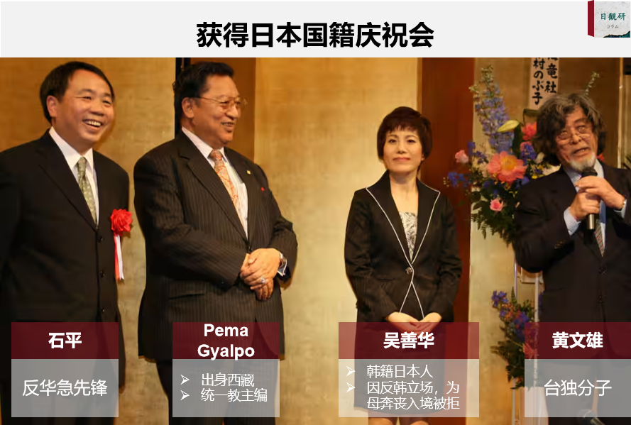 與他一同入籍日本的,都是各種賣國求榮之輩,包括邪教“統一教”成員、達賴集團成員白瑪嘉波,曾否認慰安婦存在、支持參拜靖國神社、狂熱鼓吹“大日本帝國”的“韓奸”吳善花(音譯),以及“臺獨”分子、曾否認南京大屠殺的黃文雄。
