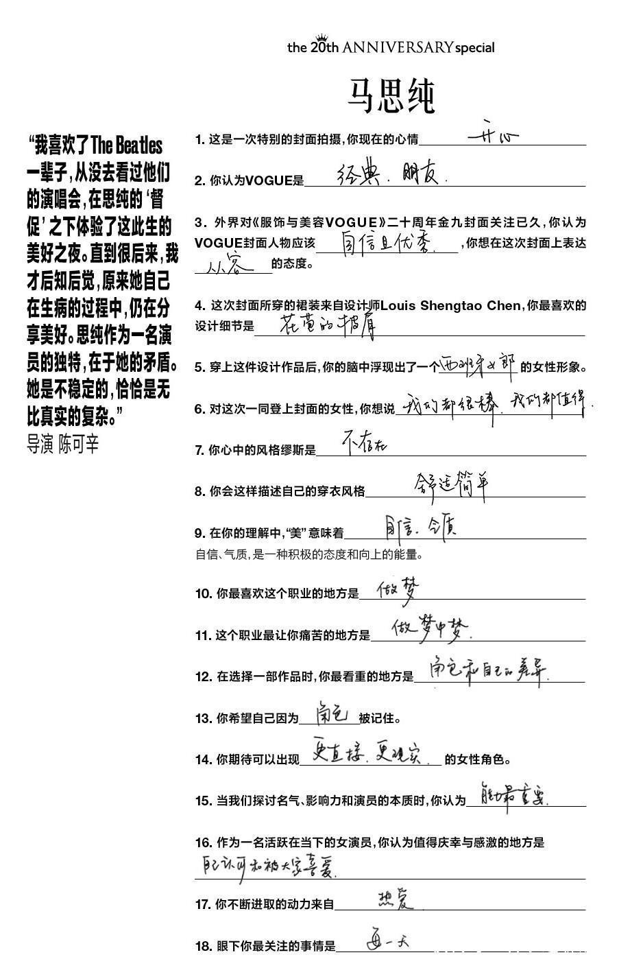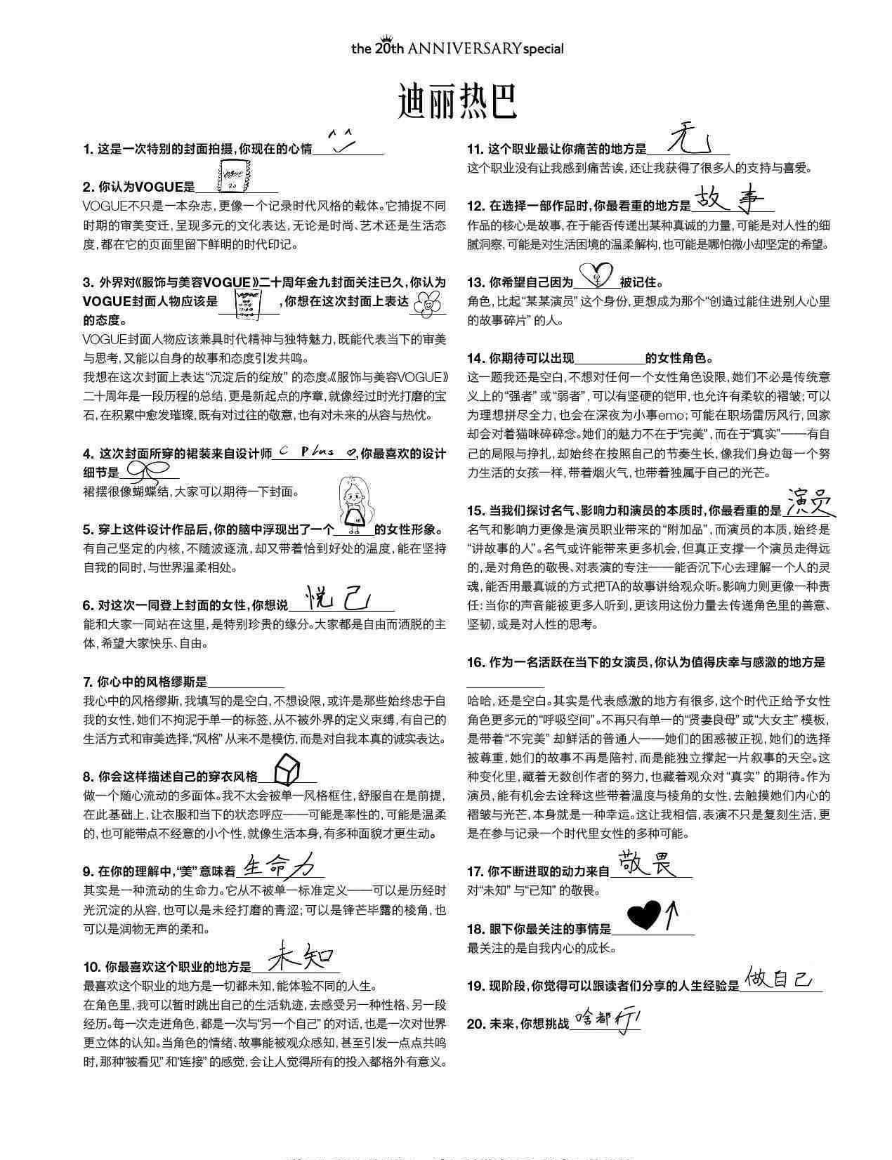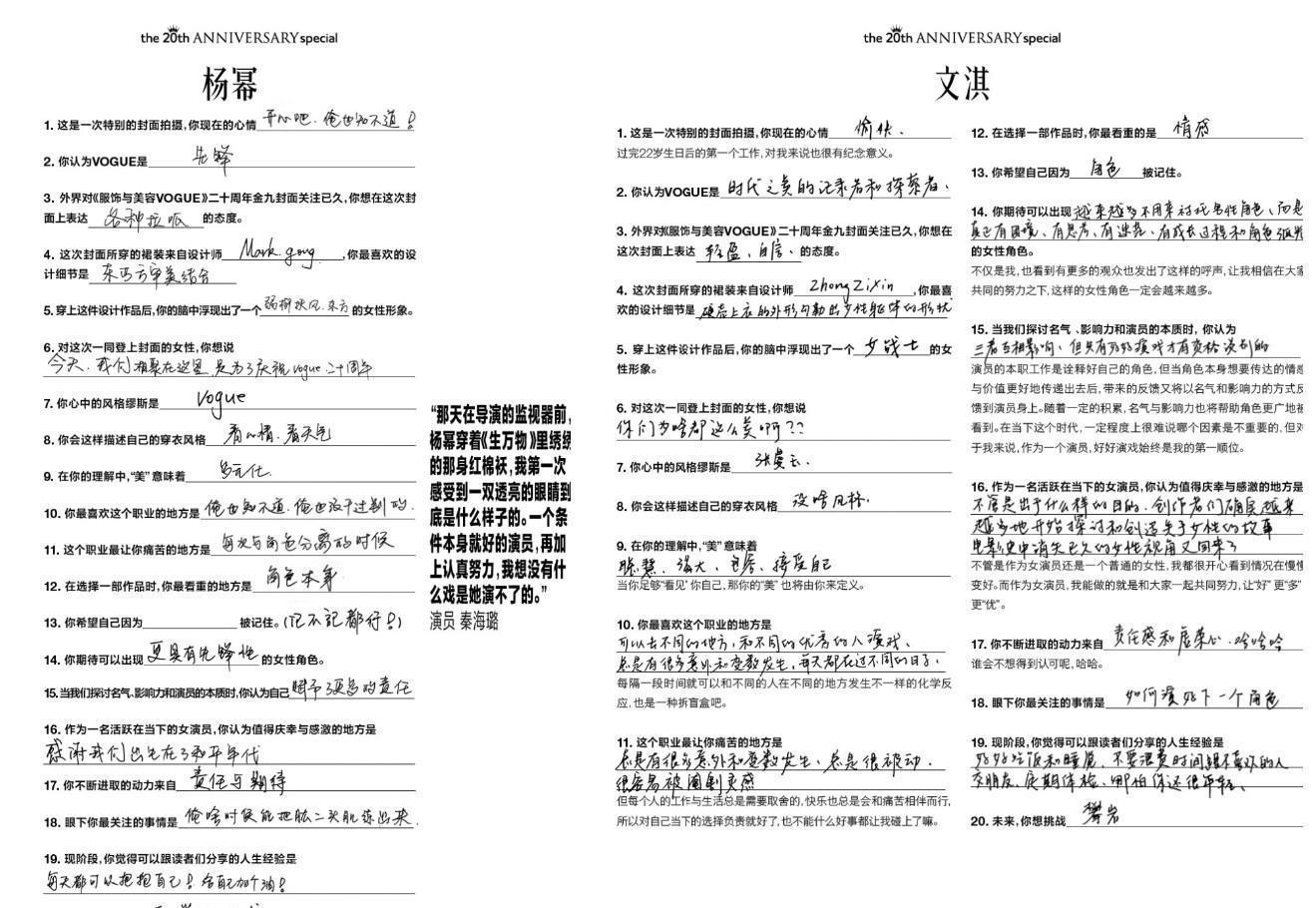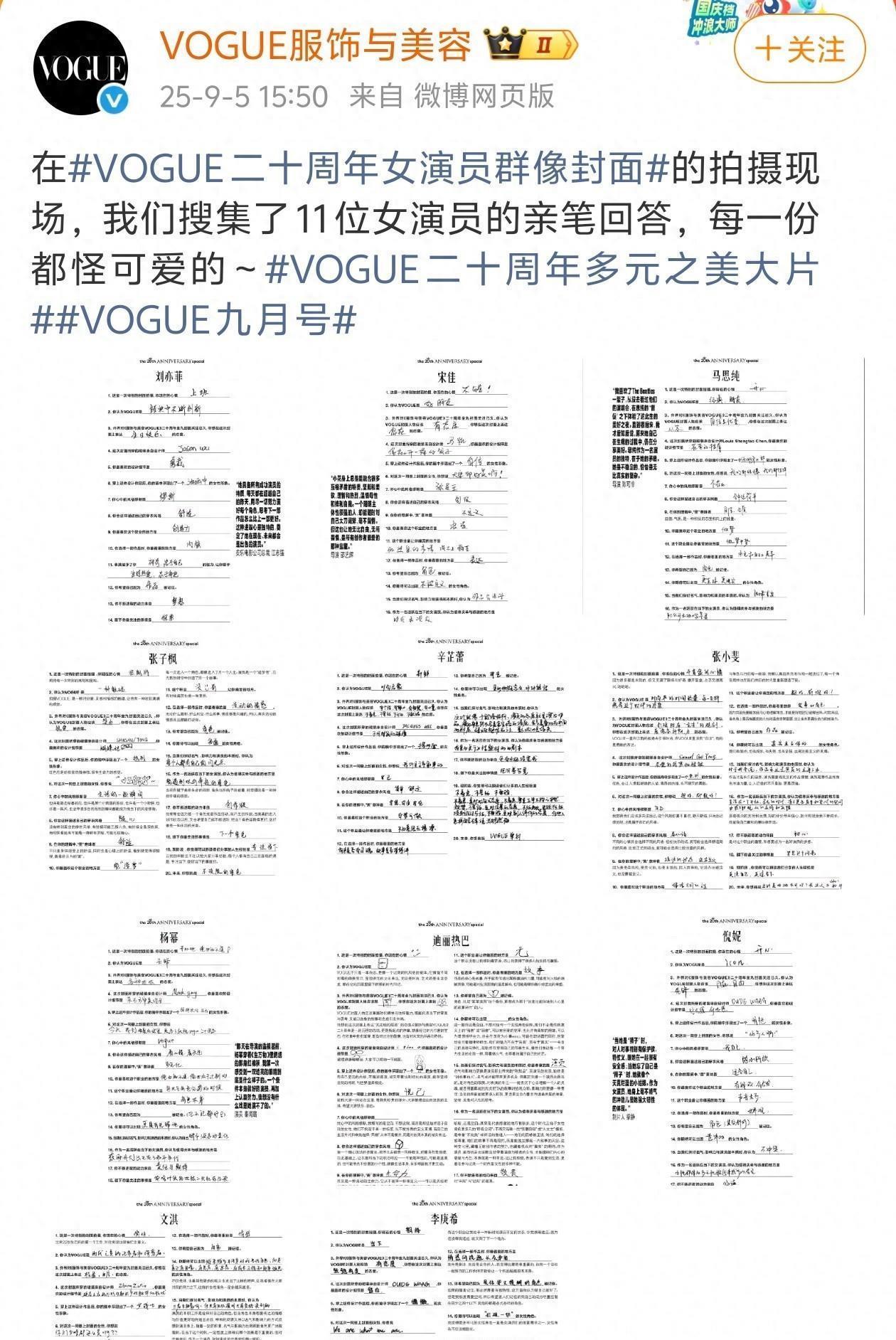 VOGUE20周年金九封面的11位女明星幕后花絮大公開,她們的手寫筆記也被官方賬號發動態分享。