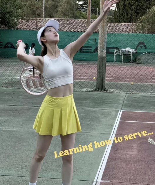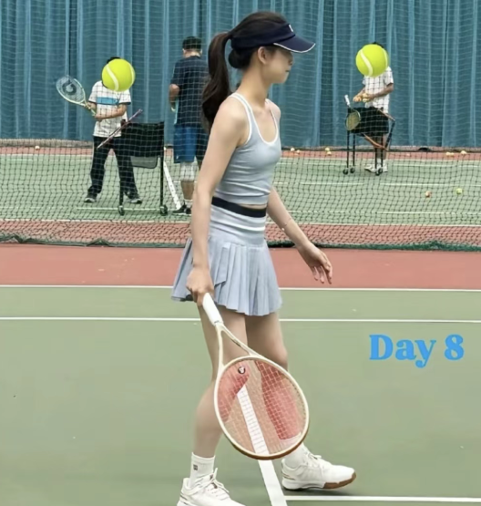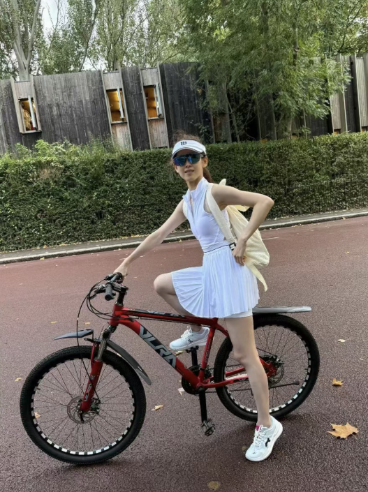 照片里她一会儿骑着单车,一会儿打网球,还配文 “day8”,看来是坚持运动第八天了。从侧面能看出她身材很瘦,但不是娱乐圈那种不健康的 “白幼瘦”,背部线条明显,隐约能看到腹肌,腹部平坦得没有一丝赘肉,腿部线条也又细又长,这状态一看就是经常健身、生活规律的结果。