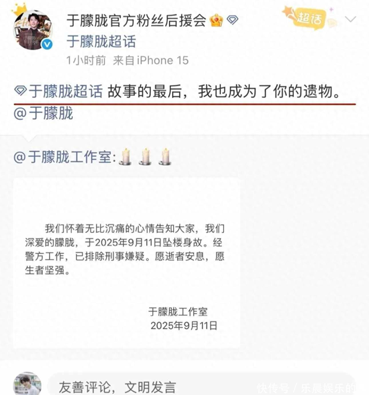 9月11日深夜,一則訃告讓娛樂版面突然安靜下來,于朦朧的演藝工作室確認了他去世的消息,粉絲們看著屏幕上的最后對話,感覺像是隔了一個世紀。