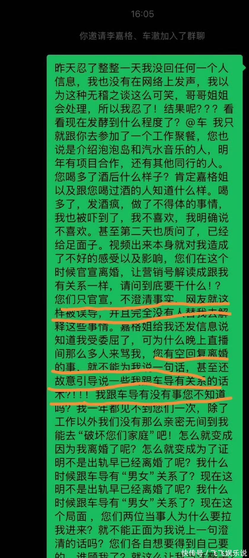 從她發(fā)的圖片能看出,她是把車澈和李嘉格拉進(jìn)了一個(gè)群,發(fā)長(zhǎng)文訴說(shuō)自己的委屈,希望兩人能為自己澄清。