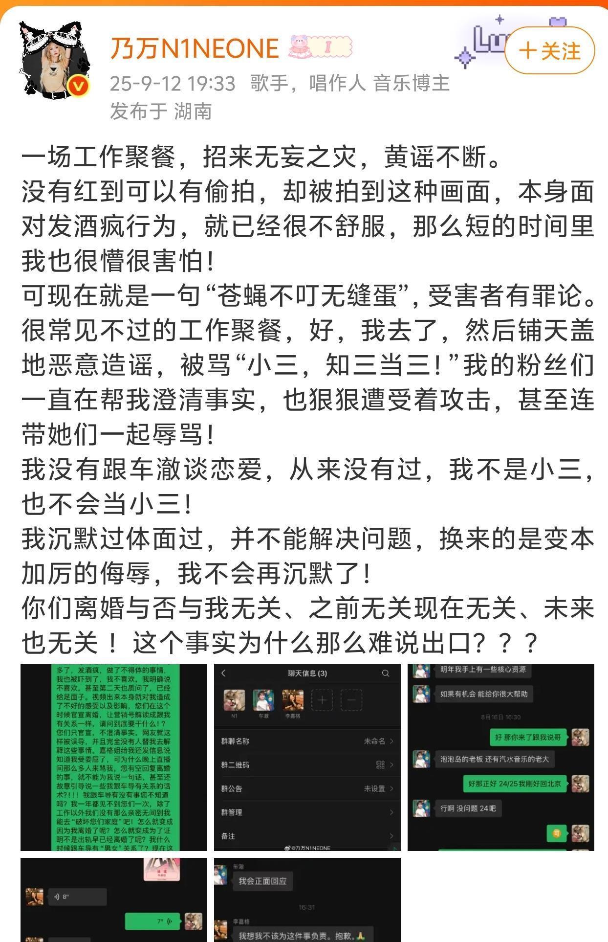 隔天乃萬(wàn)發(fā)文為自己澄清,說(shuō)自己被造黃謠、被罵“小三”純屬無(wú)妄之災(zāi)。車澈在那發(fā)酒瘋,她也很不舒服很懵很害怕