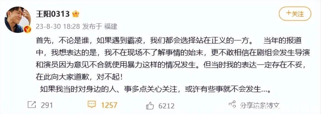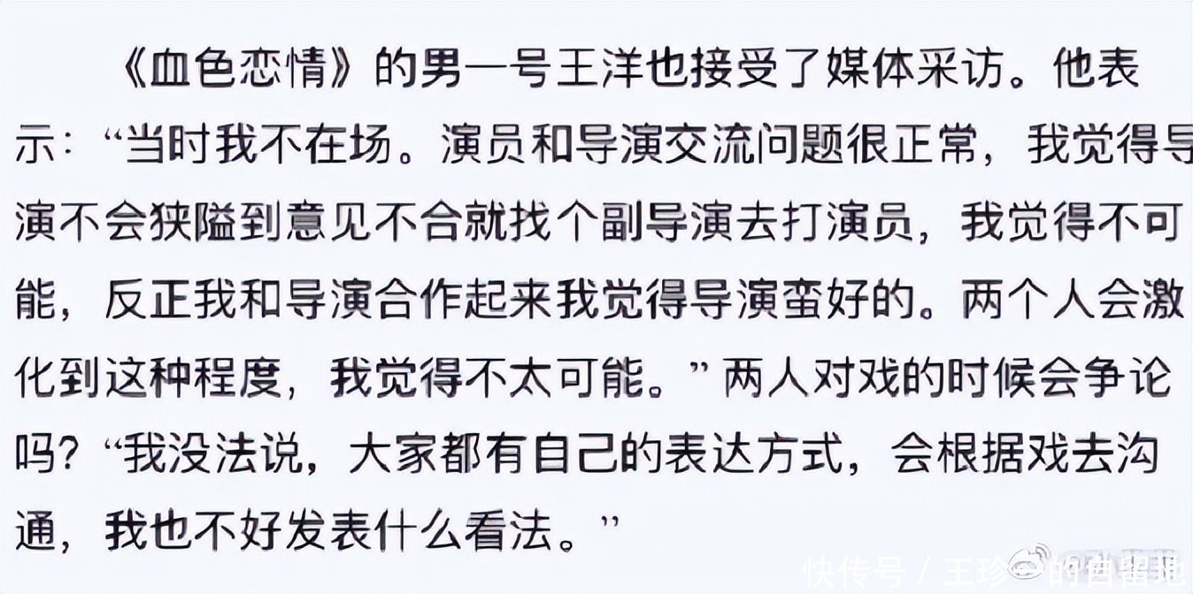 彼時,有記者問他怎么看待此事,王陽說他當(dāng)時不在場,他說他覺得導(dǎo)演不會狹隘到意見不合就找副導(dǎo)演去打演員,他還說他和導(dǎo)演合作,覺得導(dǎo)演蠻好的。