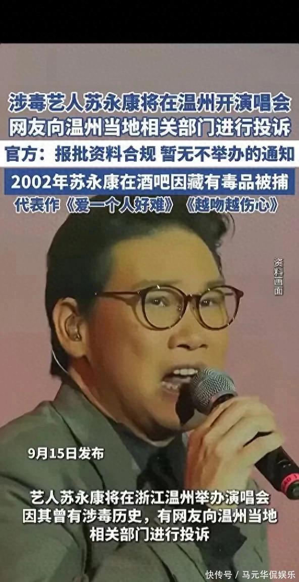 #媒体:涉毒艺人不能复出是底线#近日娱乐圈又添一笔“污点”,老牌歌手苏永康原本准备在温州开唱,没想到刚刚宣布就被网友“火线举报”。9日,大麦网迅速将他的演出从售票平台下架,仿佛一夜之间,他的演唱会变成了“空气中的幻影”。相关部门也没有闲着,收到举报后,开始紧锣密鼓地处理,演出主办方已向审批单位提交了取消申请。一场原本热闹的演唱会,就这样在“涉毒”阴影下戛然而止,仿佛告诉所有艺人:底线,就是不能踩!否则再红也只能“凉凉”。
