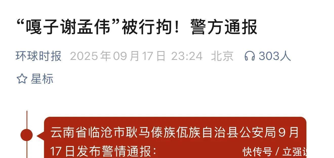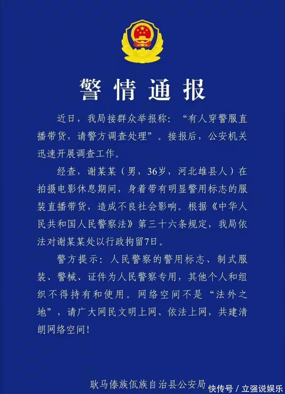9月18日凌晨,云南耿馬警方的一則通報引爆網絡:一名36歲河北雄縣男子謝某某,因身穿仿制警用服裝進行直播帶貨,造成不良社會影響,被處以行政拘留7日——這個人,正是演員謝孟偉。