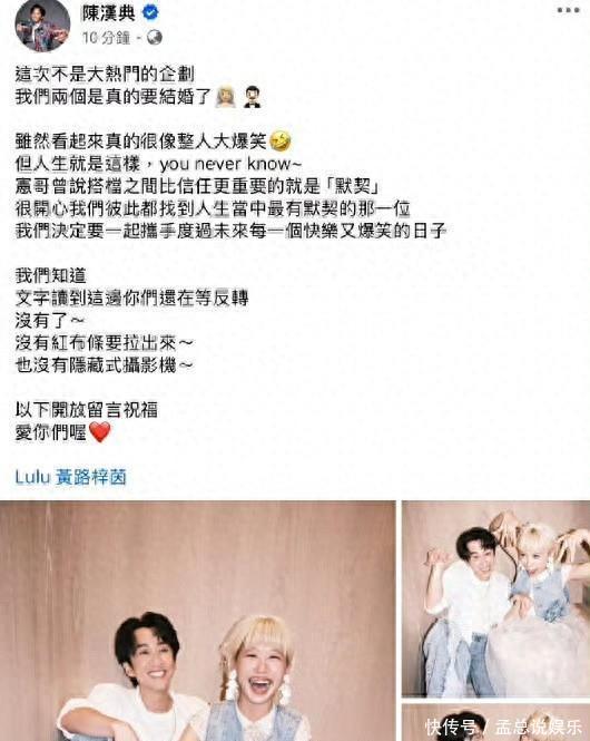 官宣金句:"人生就是這樣,you never know"--既回應外界驚訝,亦呼應兩人隨性真實的性格。陳漢典宣布結婚,臺媒都報道了一整天了阿Ken才知道:“娛樂圈沒有真感情,娛樂圈也沒有真朋友”