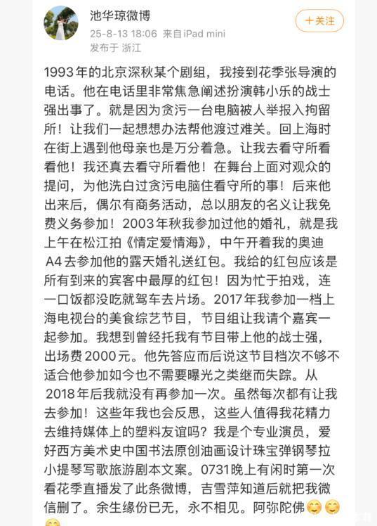 ?????? 這也讓不少人猜測是不是鬧了什么矛盾,直到池華瓊發長文自曝缺席原因,才知道原來他和戰士強之間有這么多恩怨糾葛。?????? 甚至還因為這件事和吉雪萍也鬧掰了,互刪了微信,稱永不相見!