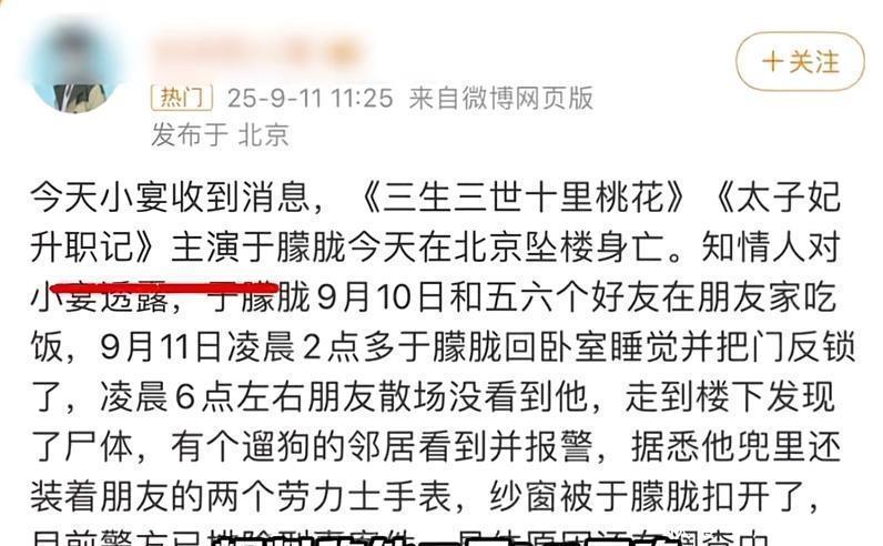 不僅如此,第一時間并不是官方通報,而是私人博主發(fā)文透露了于朦朧墜樓身亡的消息。稱于朦朧前一天五六個好友在北京一處住宅區(qū)聚餐,期間他提前結(jié)束回臥室反鎖門去睡覺了。