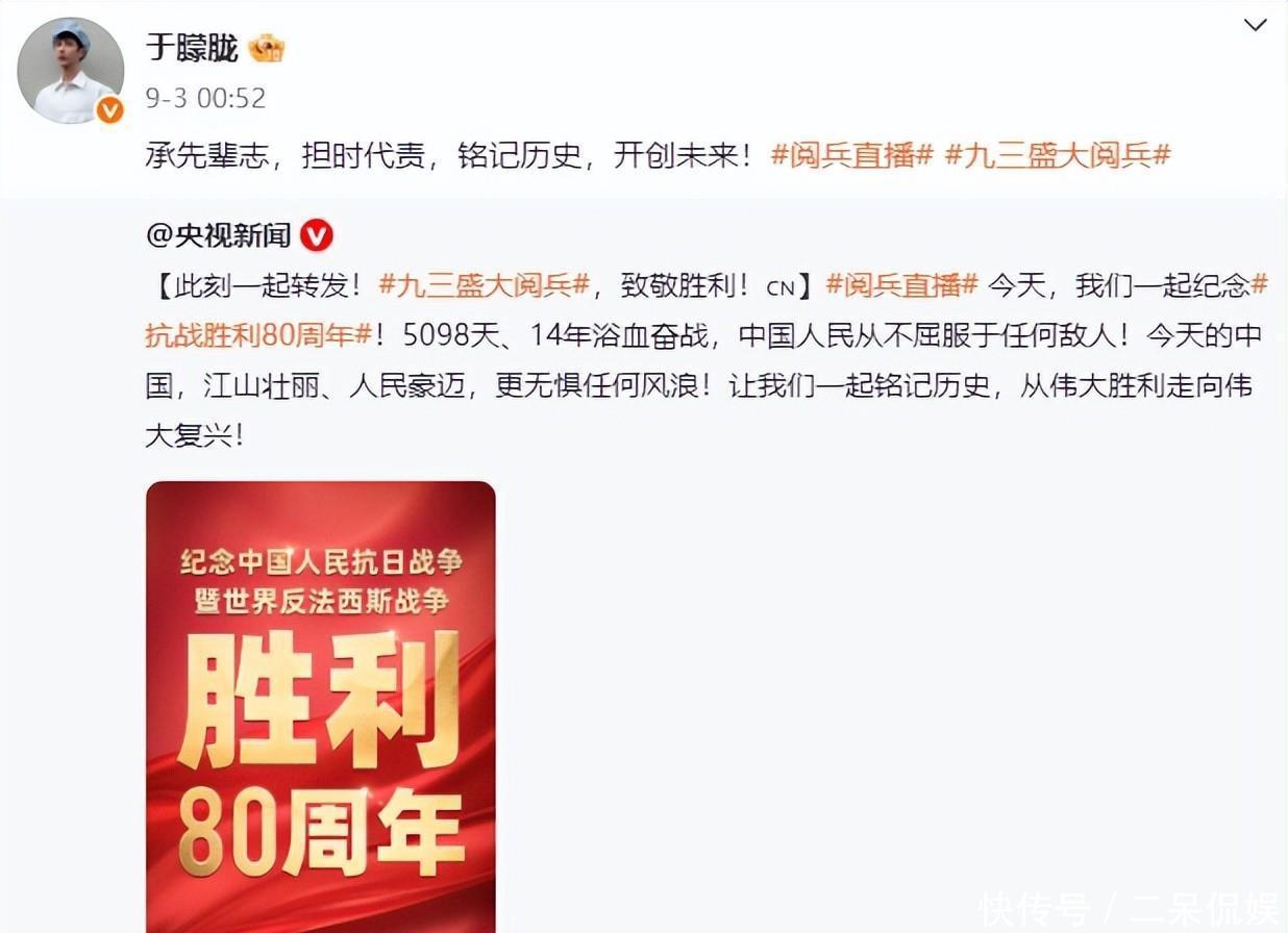并在9月3日大閱兵當(dāng)天,于朦朧還轉(zhuǎn)發(fā)了央視的新聞,配文“承先輩志,擔(dān)時代責(zé),銘記歷史,開創(chuàng)未來!”。字字句句 ,都充滿了正能量!