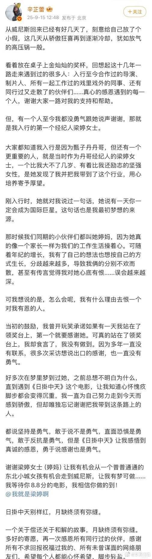 事件源于辛芷蕾榮獲第82屆威尼斯國際電影節最佳女演員獎后發表的感言。這位從黑龍江鶴崗走出的女孩,站在世界舞臺上哽咽著說出:"十幾年前我剛入行的時候吹過一個牛,我說有一天我一定要站在世界級的舞臺上,我想成為一個國際巨星。"但她當時并未提及那個最初給她這個夢想的人——她的第一任經紀人梁婷。獲獎歸來后,辛芷蕾經過沉淀反思,終于在社交媒體上發表長文,公開感謝梁婷女士:"有一個人至今我都沒勇氣跟她說聲謝謝,那就是我入行的第一個經紀人梁婷女士。剛入行時,她就對我說過一句話,她說有一天你一定會成為國際巨星。這句話也是我最初夢想的來源。"