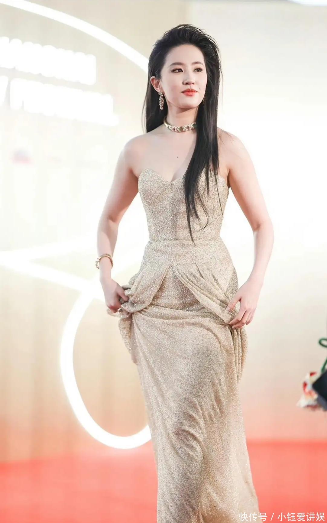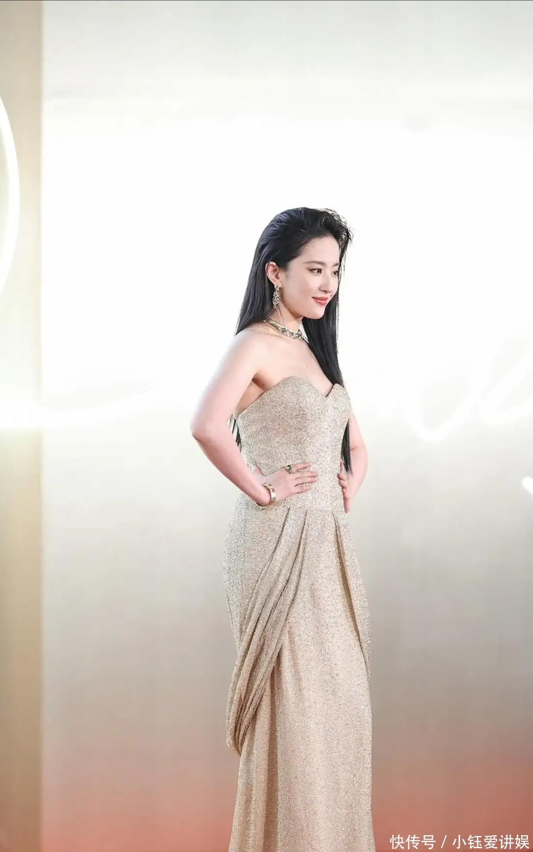 天吶!劉亦菲金色長裙造型,美成行走的星河