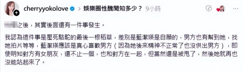 據她描述,得知藍潔瑛事件的真相源于自己曾經的朋友,當年那件事發生時,她的朋友被大佬邀請到現場觀看。當時藍潔瑛以為只是單純的朋友聚餐,于是便打扮得十分漂亮前往約定的地點,但打開門之后,等待她的卻是“魔鬼一般的折磨”。