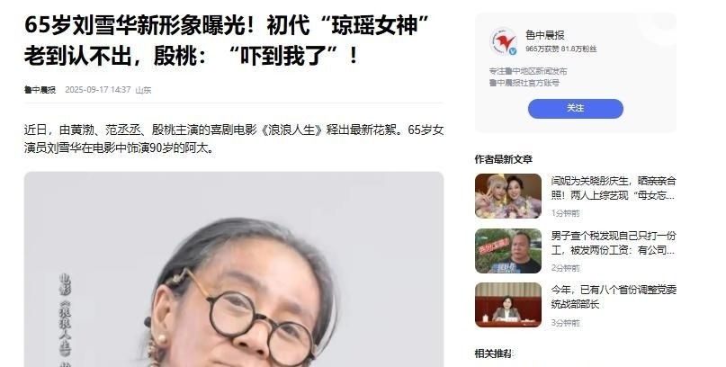 65歲劉雪華新形象曝光!初代“瓊瑤女神”老到認不出,殷桃:“嚇到我了”!.魯中晨報.2025-09-17