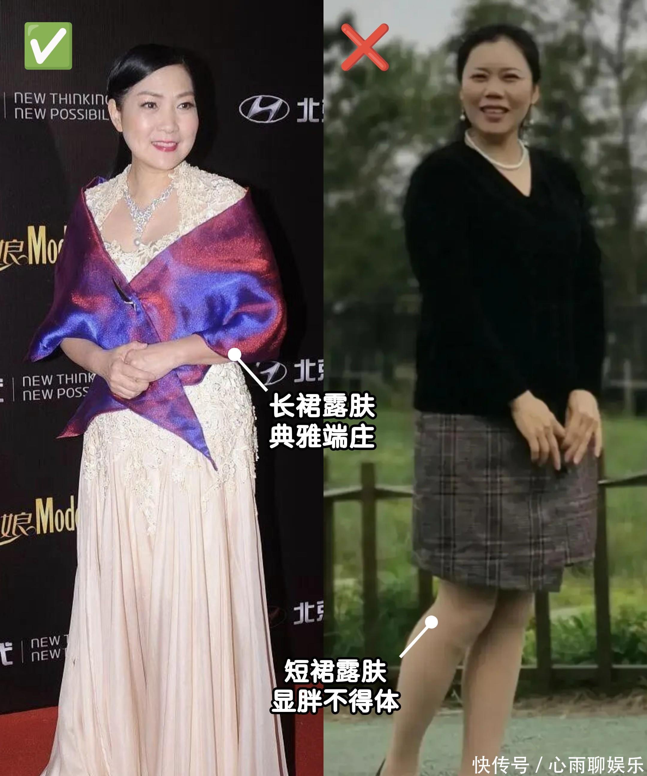我生活中見過太多大齡女性在穿搭上“用力過猛”,拼命地往身上套粉色蓬蓬裙、蝴蝶結或超短裙等活潑少女風的單品。可你要知道,衣服太活潑反而更會突出你外形、氣質的老態,效果還不如右邊這種渾身基礎款、看似簡單的打扮。(第二種)擺爛的“老年裝”,穿上就變大媽