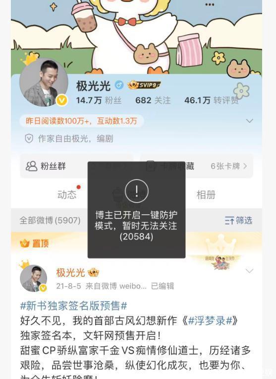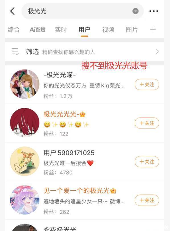 搜索极光光的账号可以发现,根本就找不到他账号,即便通过网友艾特的账号找到,但也是禁止关注的状态。