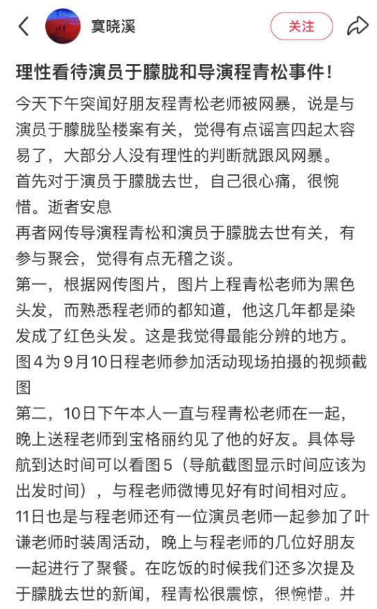 9日程青松与朋友一起参加了叶谦老师的时装周活动,也是红发造型,在吃饭的时候也提及了于朦胧去世的新闻,程青松表示很震惊,很惋惜,并不认识于朦胧。