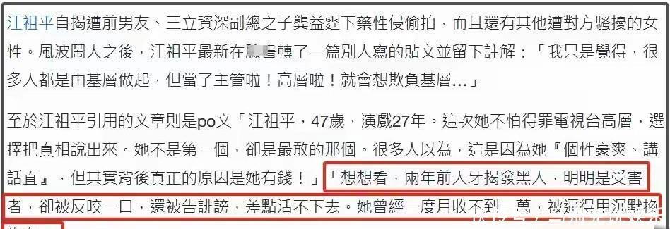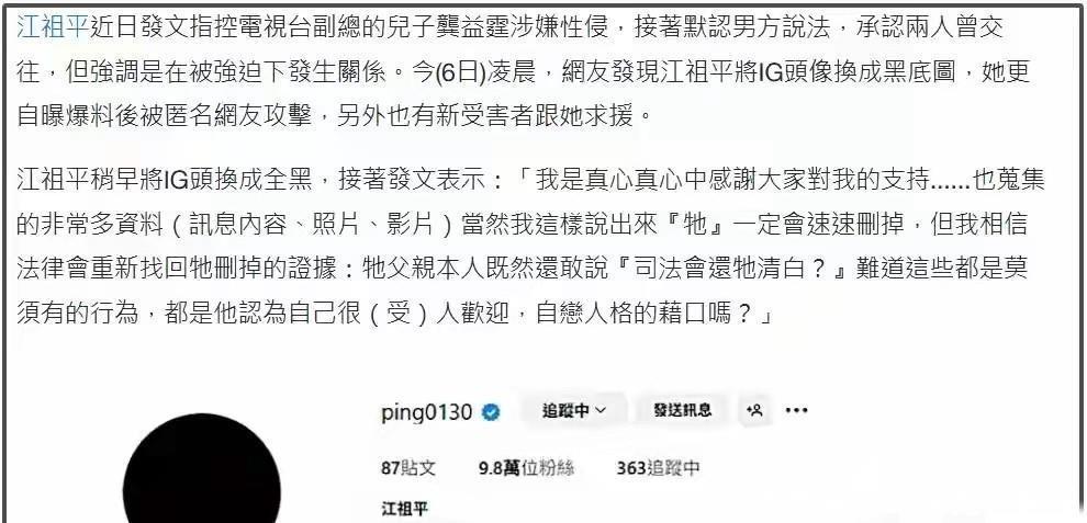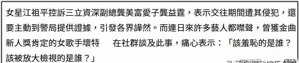 9月初,47岁台湾女演员江祖平在社交媒体上连发多条动态,来说明她的遭遇。她指控自己遭到了电视台高层之子龚益霆的性侵,甚至发布了“不自杀声明”,直言要让对方“跪在灵堂前忏悔”。而这则消息一出来,让整个台娱圈都震惊了。