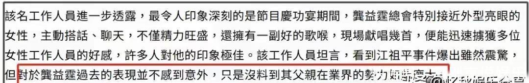 这次儿子出事,龚美富的反应也很快。台媒报道称,在儿子被公开指控后,龚美富已迅速“暂停职务”。有熟悉台娱内幕的匿名人士表示,龚家在圈内多年经营,关系盘根错节,影响力比外界看到的可能更深。这也就能侧面解释,为什么江祖平事件发生后,台娱圈呈现出一种诡异的“静默”。