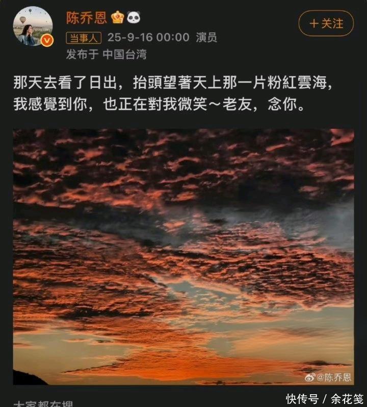 今天刷到陳喬恩的新動態,又是那片熟悉的粉紅云海。配文里說:“那天去看了日出,抬頭望著天上那一片粉紅云海,我感覺到你,也正在對我微笑~老友,念你。” 時間剛好是 9 月 16 日,掐指一算,這已經是第九年了。九年前的今天,喬任梁走了。粉色是他生前最愛的顏色,專輯封面、舞臺燈光全是粉粉的,連墓地都鋪滿了粉色裝飾。所以每年這天,陳喬恩都會找一張最美的粉紅云海照片發出來,像在跟老朋友說說話。他倆 2009 年合作《春光燦爛豬九妹》認識的,后來又一起拍了兩部戲。喬任梁總像小太陽一樣,跑遍各地找限量款玩偶送她,還會扮成玩偶突然出現逗她笑。陳喬恩說過,自己本來不喜歡驚喜,唯獨喬任梁給的除外。最戳人的是他走后的第二年,陳喬恩居然還收到了他提前備好的生日禮物。她當時說 “不是不喜歡驚喜,而是制造驚喜的人不在了”,看一次哭一次。這些年陳喬恩常去看喬爸喬媽,陪他們吃飯散步。今年因為籌備婚禮沒法親自去看喬任梁,就托叔叔阿姨帶了花,還寫了信:“你一定會祝福我的,明年再來看你。”評論區好多人曬出各地的粉色天空,有人說 “他沒真的離開,我們替他看風景呢”。