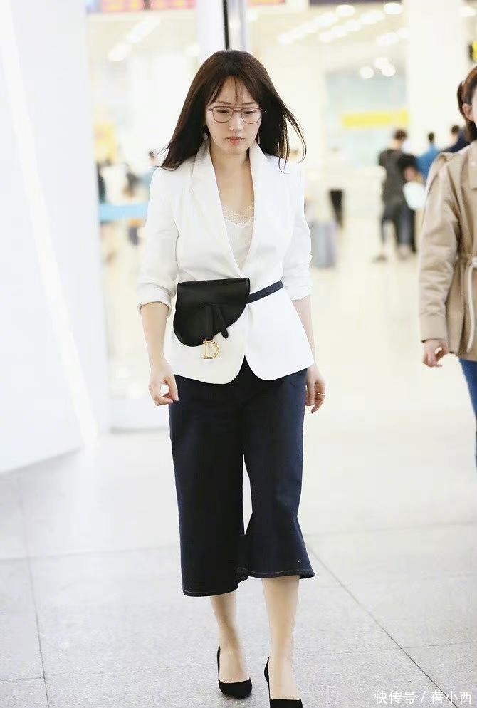 通勤搭配的時候,西裝必不可少,楊鈺瑩身著一襲白色西裝外套,簡潔的剪裁完美勾勒出她的身形,盡顯干練與優雅。白色向來給人純凈、大方之感,在機場的人潮中格外亮眼,下裝選擇了黑色五分闊腿褲,褲型寬松舒適,修飾了腿部線條,顯得她腿部更加筆直修長。腳上搭配一雙黑色高跟鞋,經典的黑白配色不僅提升了整體造型的精致感,還在視覺上拉長了身形,讓她看起來更加挺拔。