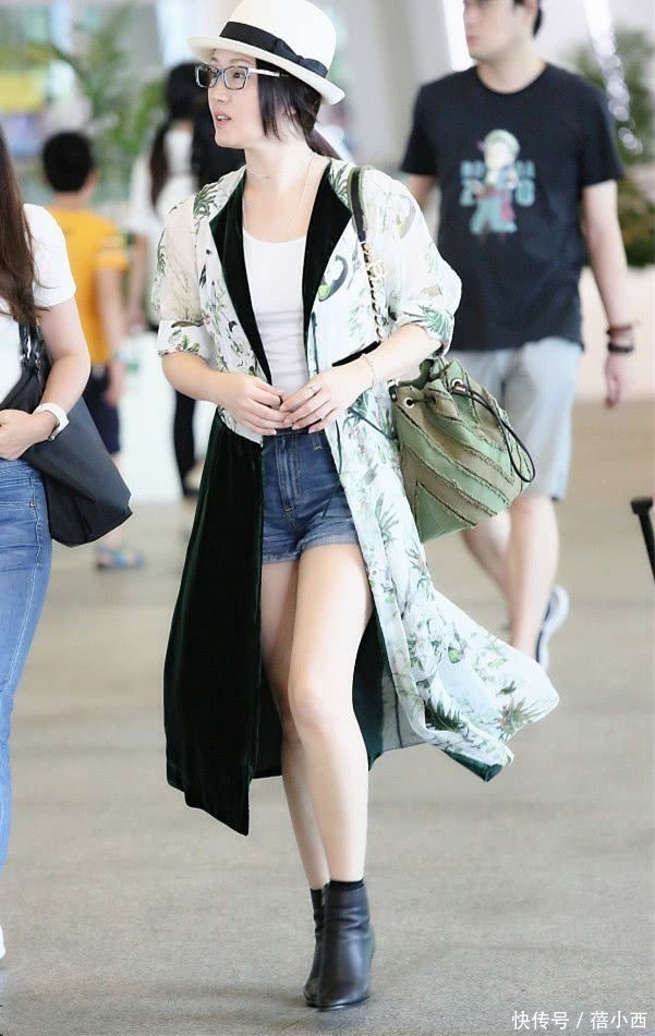 楊鈺瑩總是能把機場變成秀場,這一身搭配中,她頭戴一頂白色寬檐禮帽,禮帽上的黑色飾帶為整體造型增添了一絲精致感。內搭一件簡單的白色T恤,隨性百搭,外搭的印花長外套是這套穿搭的亮點,輕柔的面料結合了清新的植物印花,充滿了自然的氣息,走動間衣袂飄飄,盡顯隨性灑脫,配著黑色短靴,更是非常有氣場。