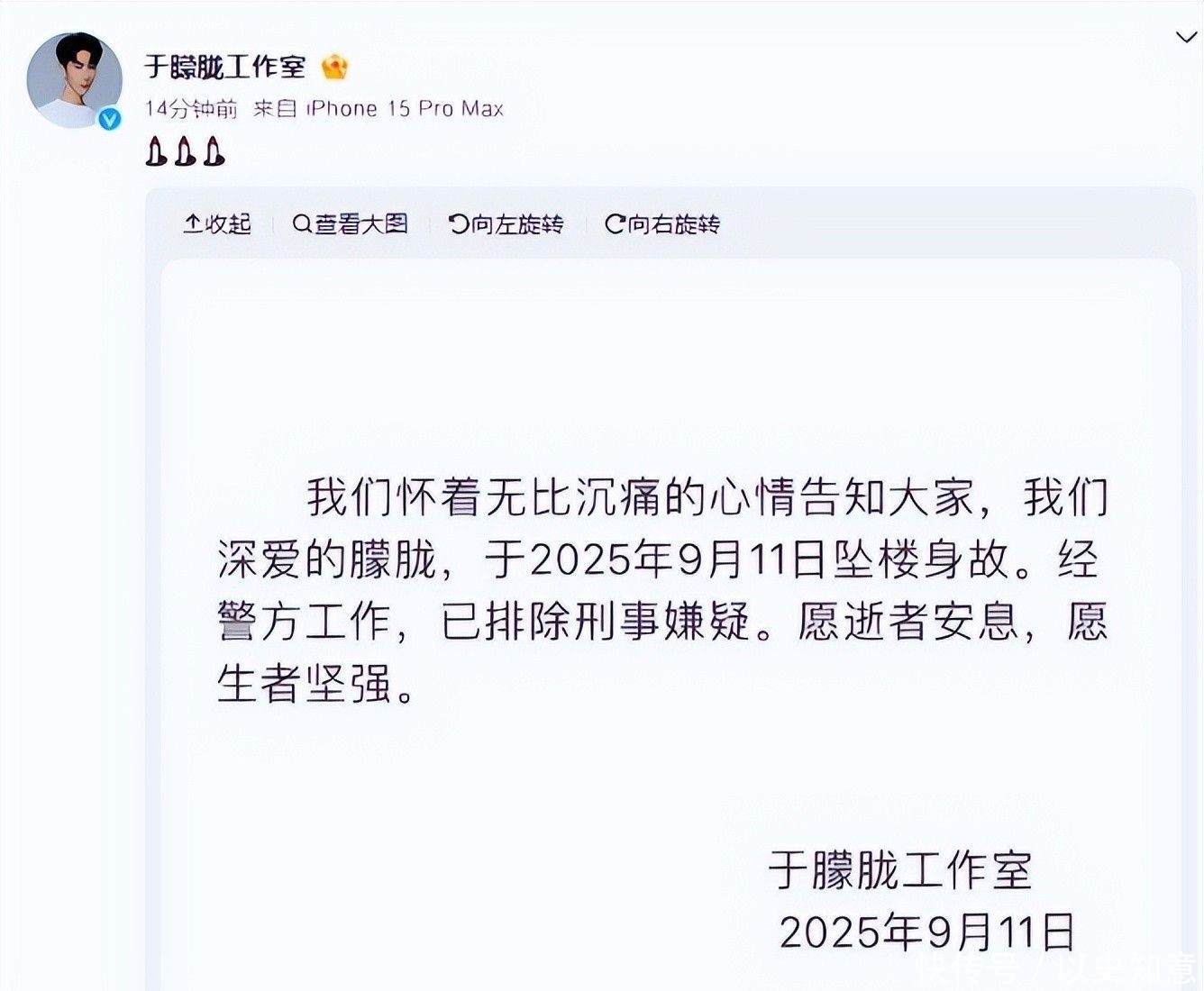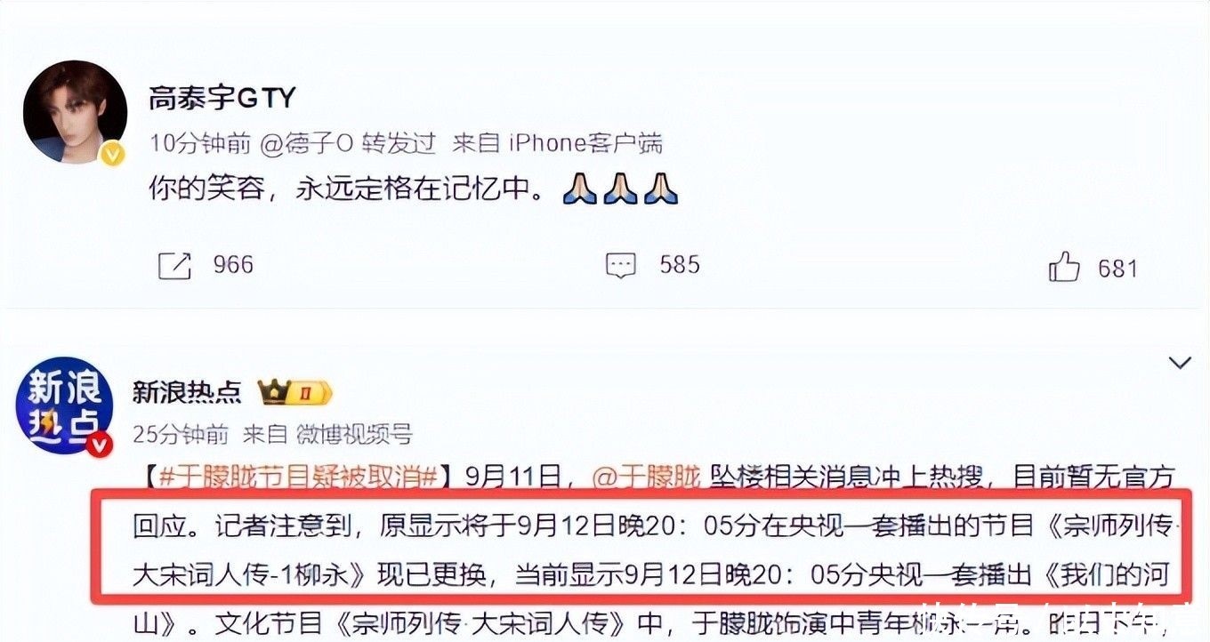 就在這個月的閱兵期間,于朦朧還轉發了相關報道,表達了銘記歷史的情感,看起來精神狀態良好。更令人費解的是,在墜樓前夜,他還登錄了社交平臺,卻什么都沒說就下線了,次日清晨便被發現死亡,他是否有什么話想說卻未能表達?