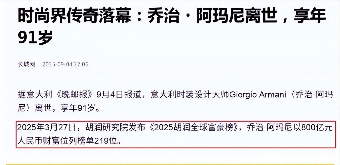 據公開資料顯示,阿瑪尼先生離世前的身家已高達八百億元,位列胡潤全球富豪榜,其名下的阿瑪尼集團年營業額超過200億元,堪稱名利雙收。