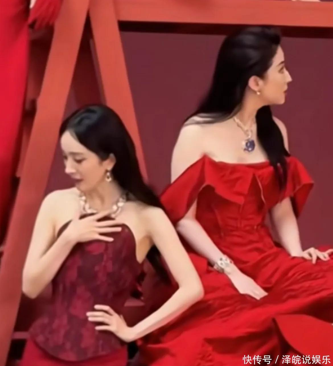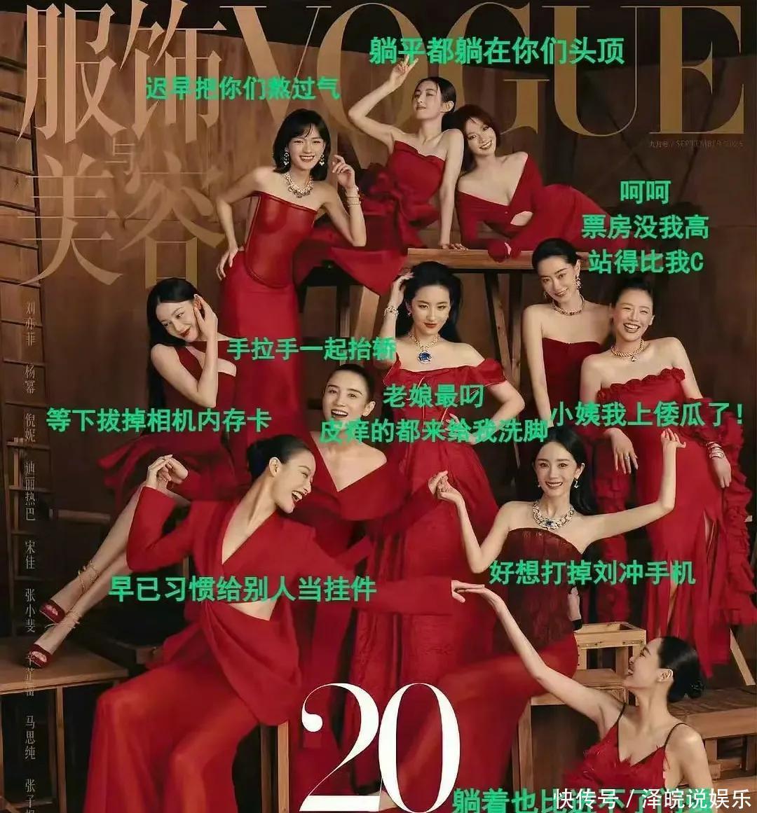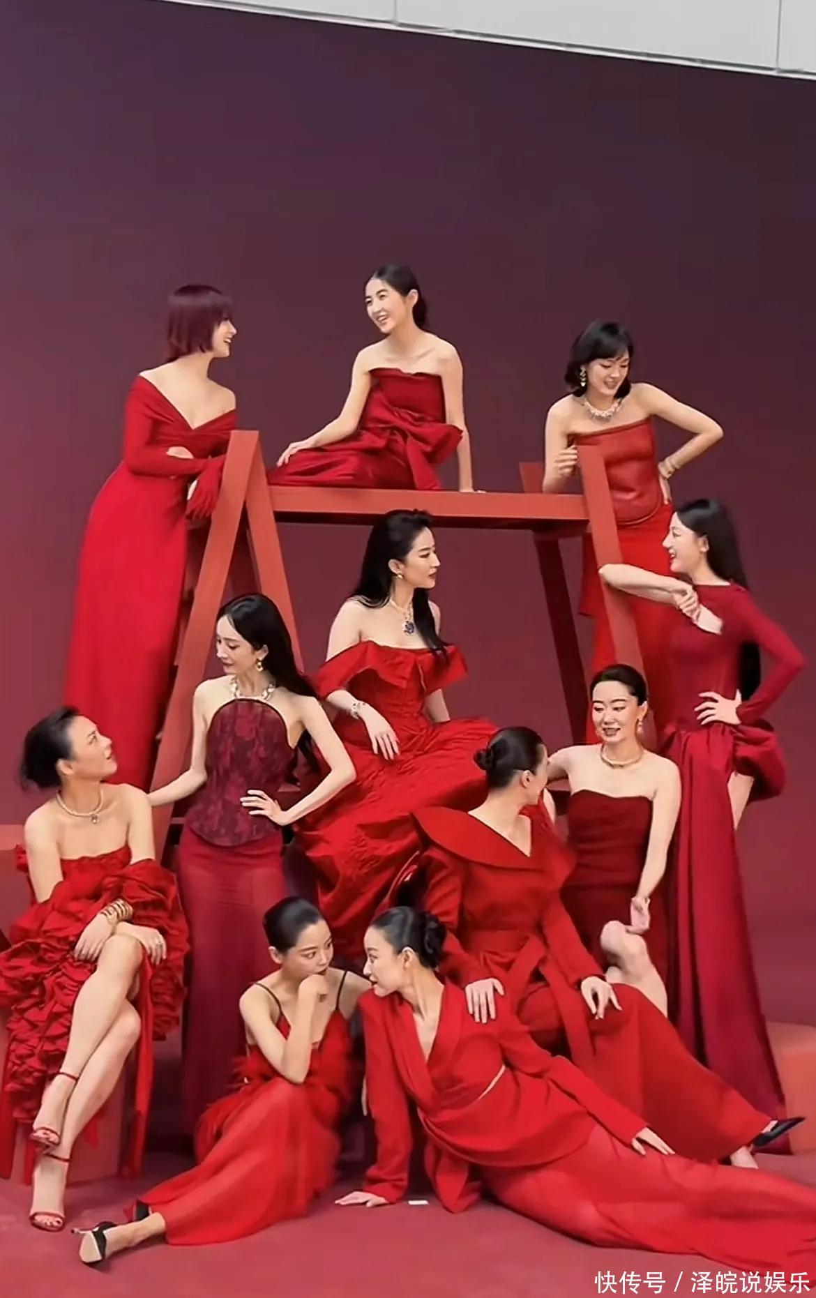 也许是大家的期待太高了,平时单个拎出来都光鲜亮丽的女明星,这次的合影却效果一般,一片扎眼的红色,被网友调侃很像是那种影楼的新娘敬酒服。