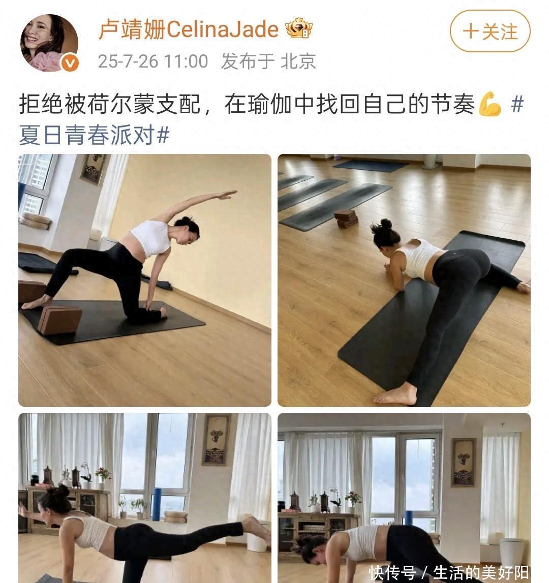 9񀙕日,怀孕九个月的卢靖姗再次晒出了自己健身照。在家健身的卢靖姗,穿着蓝色的健身衣,大秀好身材。
