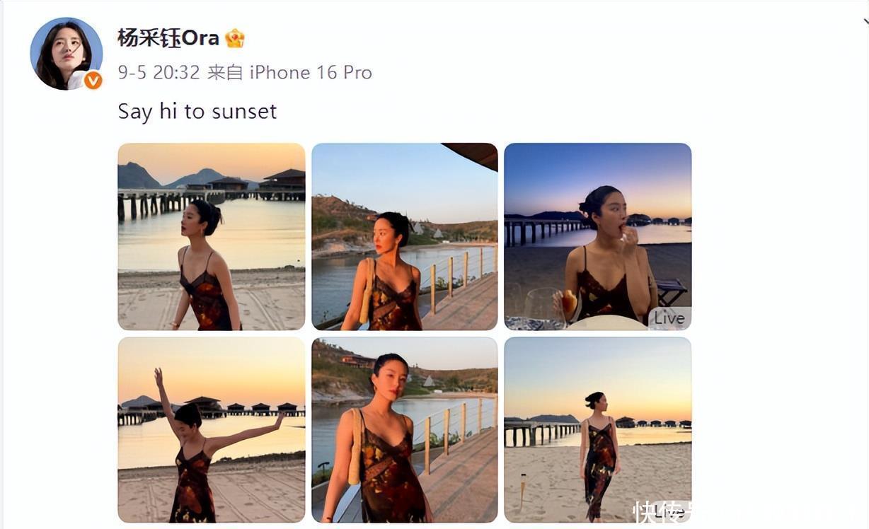 看图片的背景应该是在国外度假,海边的小房子一个连一个非常像景区的民宿,后面的照片还有她在海边享用美食的。夕阳的光线打在她的身上有一种岁月静好的感觉,海边的氛围就是很轻松前段时间杨女士的名字经常被挂在热搜上。