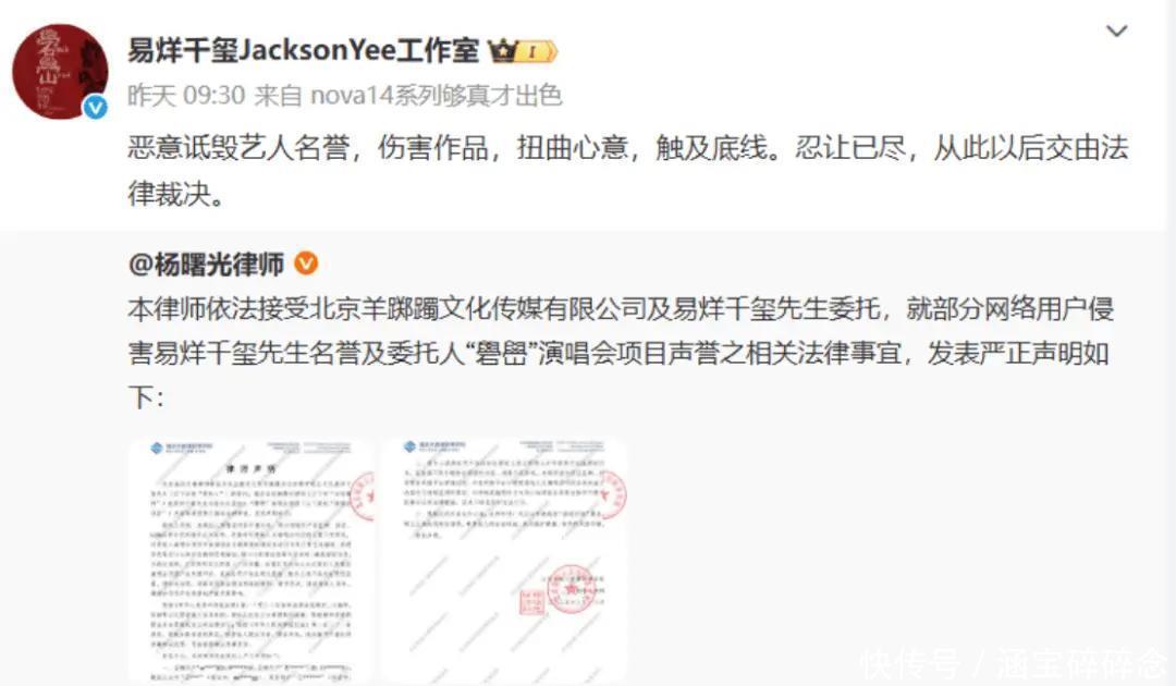 这波操作可把粉丝和工作室气坏了! 粉丝们都知道千玺喜欢泥塑,纷纷晒出自己准备的“土特产”,满心期待能参与这场大型艺术共创。工作室也立马日当天发文回应,强调心意被恶意揣测和歪曲,明确表示已全面取证,要依法追究责任。但谣言并没停止,反而越传越凶,对易烊千玺的名誉和演唱会声誉造成了严重负面影响。忍无可忍,无需再忍! 9日,易烊千玺方委托的北京海润天睿律师事务所杨曙光律师发布了严正声明。声明直指部分网络用户恶意解读、编造并传播虚假信息,甚至借此引流牟利的行为已经涉嫌侵权。目前,已对多名侵权用户提起了民事诉讼,要法律来个公断。工作室态度更坚决:“恶意诋毁艺人名誉,伤害作品,扭曲心意,触及底线。忍让已尽,从此以后交由法律裁决。” 这硬刚的态度,赢得了粉丝一片叫好。