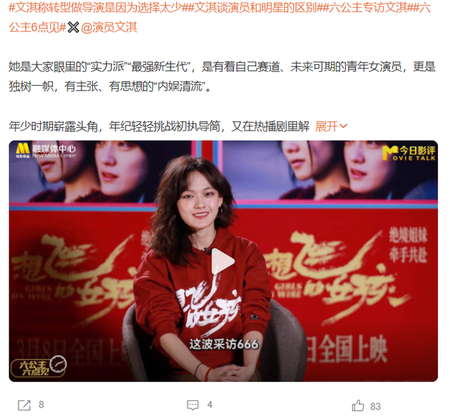 近日,“文淇称转型做导演是因为选择太少”话题登上热搜,在接受采访的时候,文淇说出自己转行做导演和制片人的原因,她表示自己的选择太少了,所以主动出击尝试更多选择。