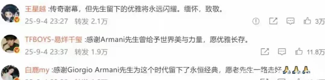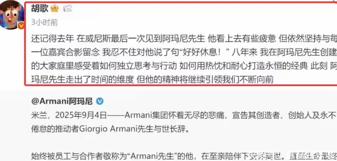 “还记得去年,在威尼斯最后一次见到阿玛尼先生,他看上去有些疲惫,但依然坚持与每一位嘉宾合影留念,我忍不住对他说了句“好好休息!”八年来,我在阿玛尼先生创建的大家庭里感受如何独立思考与行动,如何用热忱和耐心打造永恒的经典,阿玛尼先生走出了时间的维度,但他的精神将继续引领我们不断向前!”胡歌的发文深情而又怀念,让人看了有些反胃。
