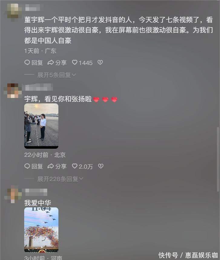 很多熟悉董宇辉的人都知道,他平时不愿意发抖音,这次看来是真的激动了,连发𱅃条视频,还条上了热榜,太让人兴奋了。