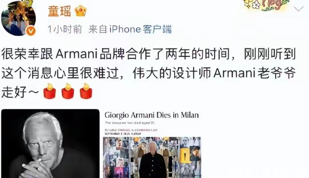 像童谣的发文也是因为和阿玛尼合作了两年,转发了两个图片,表达了思念。