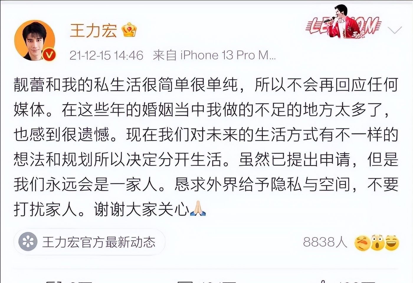 2021年,李靚蕾發(fā)文控訴王力宏離婚一事,轟動整個娛樂圈。